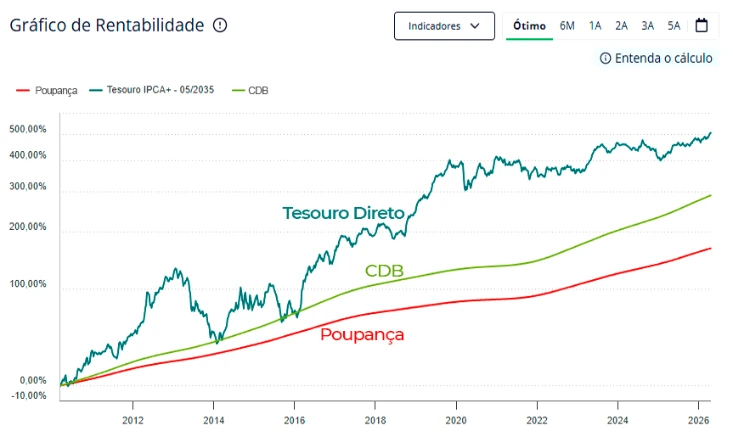 Rende bem acima da poupança, acompanhando a Selic ou protegendo contra a inflação com IPCA+.